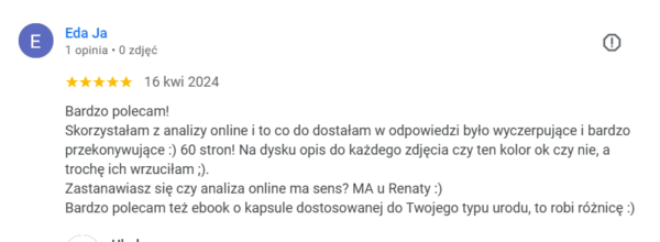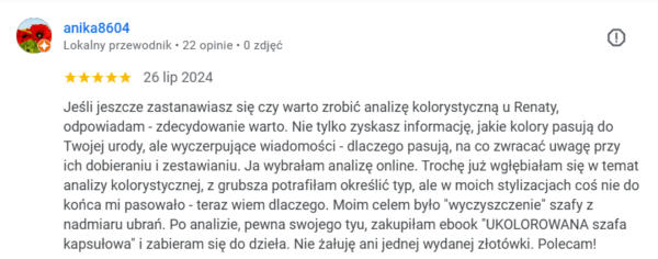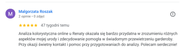 Obserwowałam instagrama ukolorowanej (Renaty) od kilku miesięcy i kompletnie przyciągnęła mnie jej energia i podejście do tematu kolorów 🙂 Z związku z faktem, iż mieszkam za granicą zdecydowalam się na analizę kolorystyczną on-line i analizę sylwetki on-line. Dzięki Renacie wiem już jakie kolory działają na moją korzyść i współgrają z moją urodą. Które z nich podkreślają moje piękno, a w których zanikam bez wieści. Dodatkowo analiza on-line sylwetki uświadomiła mi jakie fasony ubrań najlepiej podkreślą moją sylwetkę, jak używać dodatków i akcesoriów na moją korzyść, bez ślepego podążania za trendami. Pomimo iż była to usługa on-line, analizy (obszerne opracowania w formie pdf) okazały się być bardzo trafne i w bardzo dostepny sposób wytlumaczyły mi zasady którymi powinnam się kierowac przy doborze moich outfitów. Dodatkowo Renata była bardzo dostepna jeżeli chodzi o rozwianie wszelkich wątpliwości dotyczacych analizy. Uważam, że usługi które swiadczy Renata to świetna inwestycja dla kobiet, które chciałyby przede wszystkim dowiedzieć sie czegoś o sobie i zacząć dbać o swóją garderobę, oraz dla kobiet, które zawsze chciały wtłoczyć do swojej szafy kolory, ale nie wiedziały od czego zacząć. Z wiedzą, którą dała mi Renata jestem pewna, ze nie będę już kupować kompulsywnie ale bardziej świadomie, wybierając jedynie te fasony i kolory ubrań, które sprawią, że będę wyglądać zgrabnie, promiennie i wyraziście 🙂 Po mojej analizie zdecydowałam się zamówić dodatkowe analizy jako prezent na dzień kobiet dla mamy i siostry! I był to strzał w 10!! 😉 Polecam wszystkim usługi Renaty - super energia i profesjonalizm!