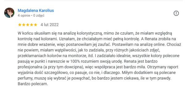 W końcu skusiłam się na analizę kolorystyczną, mimo że czułam, że miałam względną kontrolę nad kolorami. Uznałam, że chciałabym mieć pełną kontrolę. A Renata zrobiła na mnie dobre wrażenie, więc postanowiłam jej zaufać. Postawiłam na analizę online. Chociaż nie powiem, miałam wątpliwości, jak to zadziała, przy różnych jakościach zdjęć, przekłamaniach kolorów na monitorze, itd. I zadziałało idealnie, wszystkie kolory polecone pasują w punkt i nareszcie w 100% rozumiem swoją urodę. Renata jest bardzo profesjonalna (a przy tym dowcipna), więc współpraca jest bardzo miła. Otrzymany raport wyjaśnia dość szczegółowo, co pasuje, co nie, i dlaczego. Miłym dodatkiem są polecane perfumy, muszę się wybrać je powąchać, bo bardzo jestem ciekawa, ile w tym prawdy. Bardzo polecam.