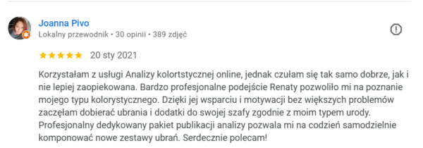 Skorzystałam z analizy kolorystycznej i analizy sylwetki online. Od samego początku kontakt z Renatą był bardzo szybki i konkretny. Renata udzielała mi dodatkowych wskazówek co do zdjęć, a kiedy okazało się, że moja uroda nie jest taka oczywista - szukała, pytala i starała się przygotować dla mnie możliwie najlepszy raport...I udało się!!! Jestem zachwycona rezultatem naszej współpracy i chociaż mam na razie mętlik w głowie, dzięki dodatkowym wskazówkom Renaty wierze, ze uda mi się zbudować szafę marzeń. Polecam z czystym sumieniem!